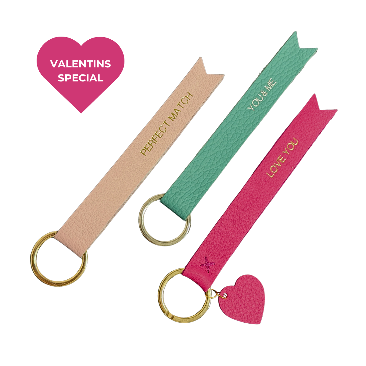 Gefertigt aus edlem Vollrindleder und veredelt im typischen TiCad Stil, liegt der Anhänger angenehm in der Hand und hält Ihre Schlüssel sicher zusammen – stilvoll, modern und immer griffbereit. Für die Valentinstagsaktion ist der Schlüsselanhänger in den drei frischen Farben Rosa, Pink und Mint erhältlich und kann mit einem von vier ausgewählten Sprüchen personalisiert werden: